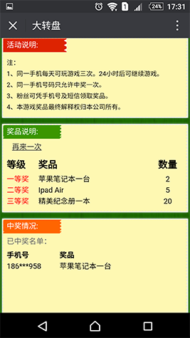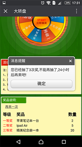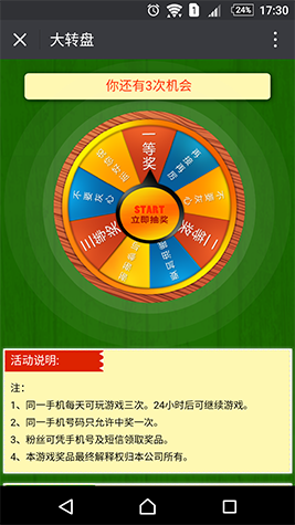 大转盘为商家提供转盘抽奖服务,商家只需设置活动时间、活动规则、活动奖品等信息就能发起活动,粉丝进入活动界面,点击开始抽奖,即有几率获得不同类型的奖品