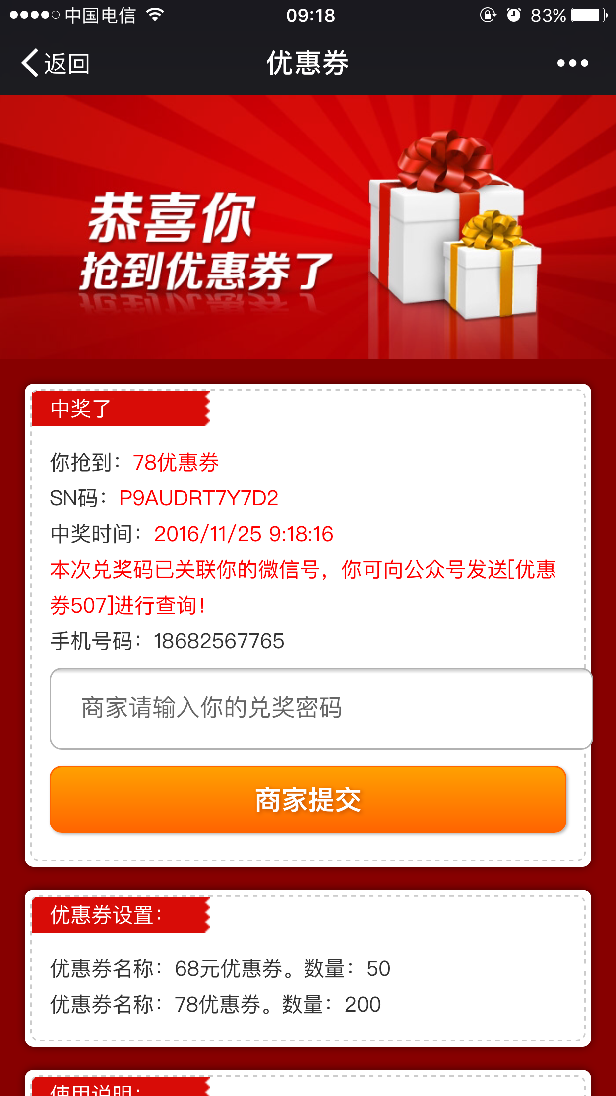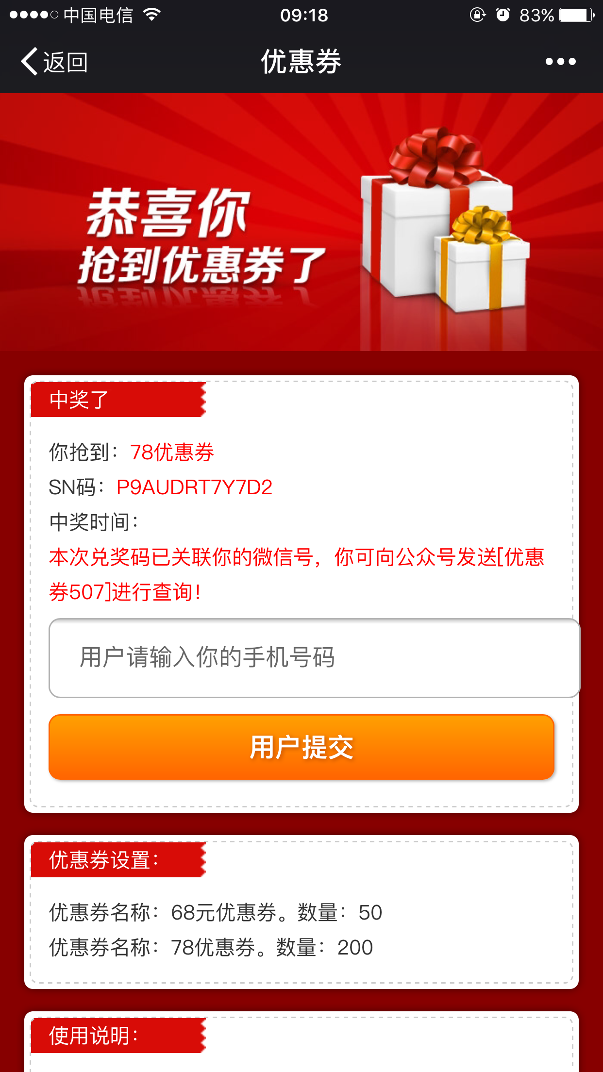 优惠券设置简便,商家只需设置活动名称、活动时间、活动奖项等基本信息。用户通过关键词进入活动界面,即时提示是否抢到优惠券,先到先得,粉丝参与活动简单便捷,是商家吸引粉丝和回馈粉丝的一款很有效的营销活动。