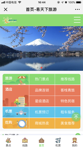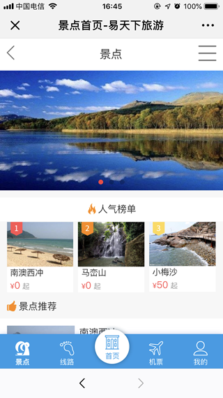 基于微信6亿用户,搭建微旅游平台,景点预览,搜周边选择旅游线路,门票在线预订、酒店预订、机票预订等功能,实现资源整合,丰富多样的互动工具、为旅游行业提供便捷好用的解决方案!