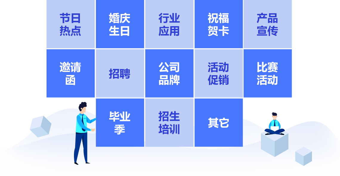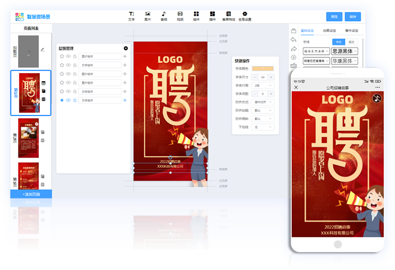 在编辑器“拖、拉、拽”,修改图片,修改文字,简单操作即可完成设计